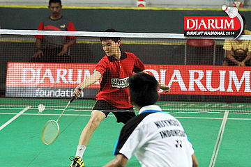 Daniel Ari Wibisono (Sarwendah) menyambar pengembalian dari Nijynsco Kaleb (Candra Wijaya)