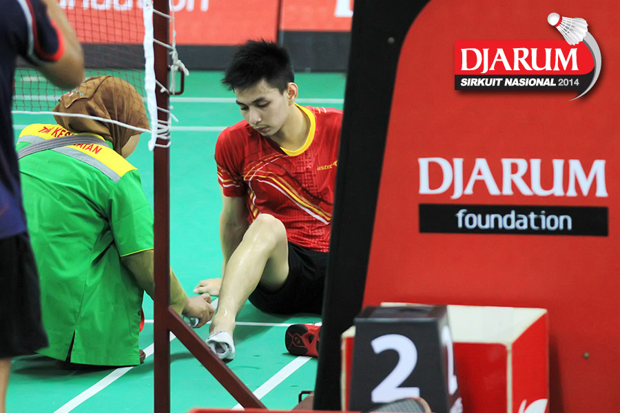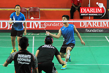 Fikri Ihsandi/Rusydina Antardayu (Tangkas) menyambut serve dari pasangan Didit Juang/Deariska Putri (Djarum Kudus)