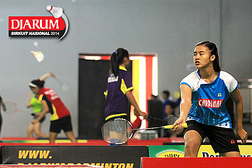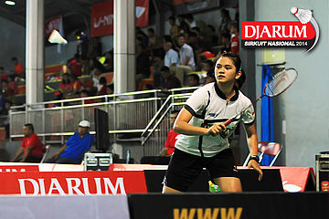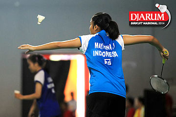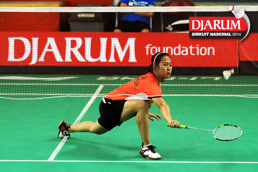 Fitria Anggraeni (Exist Sampurna) mengembalikan shuttlecock ke arah Ghaida Nurul (Djarum Kudus)