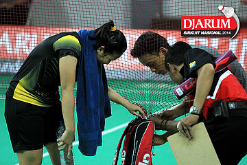 Ana Rovita (Djarum Kudus) menyambut pengembalian dari Jauza Fadhila (Pelatprov PBSI DKI Jakarta)