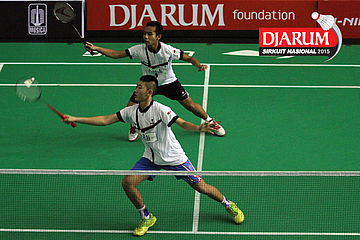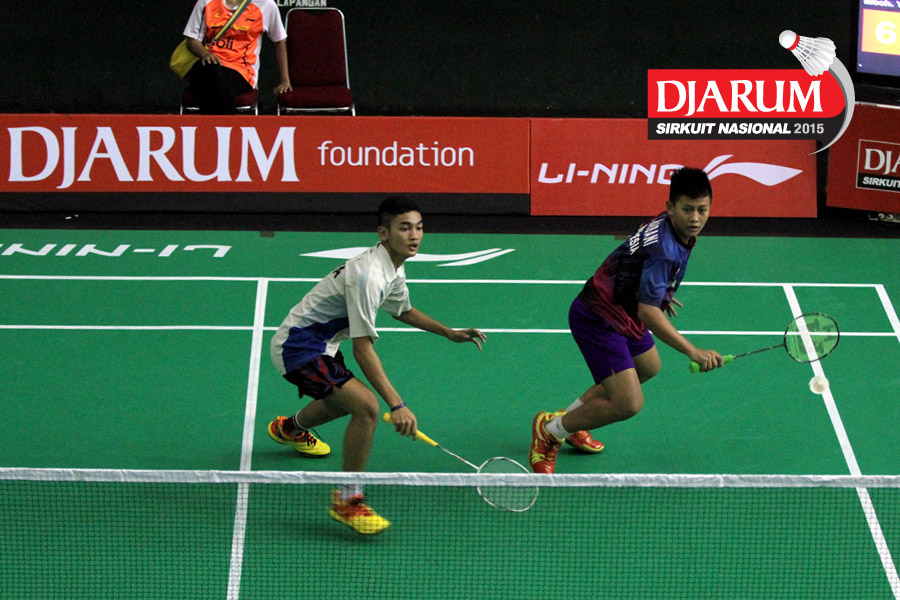 Genta Gusti/Rexky Afdillah (Djarum Kudus) berhasil menghadang serangan yang dilepaskan Hudzaifi/M. Yafi (Jaya Raya).
