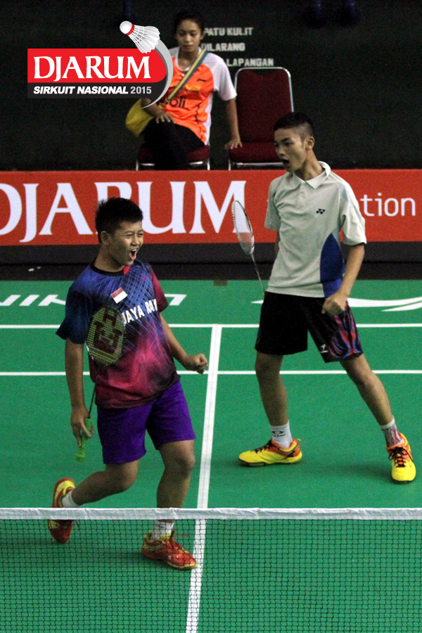 Ekspresi Hudzaifi/M. Yafi (Jaya Raya) saat berhasil mencuri poin dari Genta Gusti/Rexky Afdillah (Djarum Kudus).