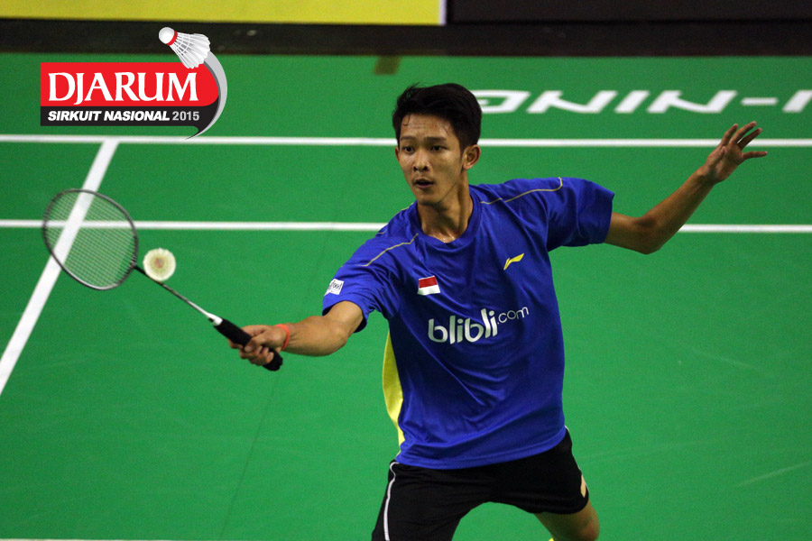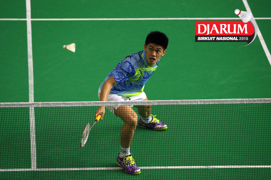 Kho Henrikho (Djarum Kudus) mengembalikan shuttlecock ke arah Muhammad Yunus (Guna Dharma).