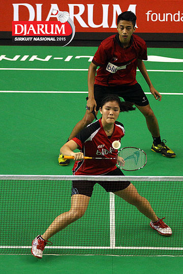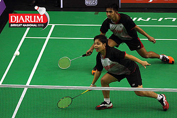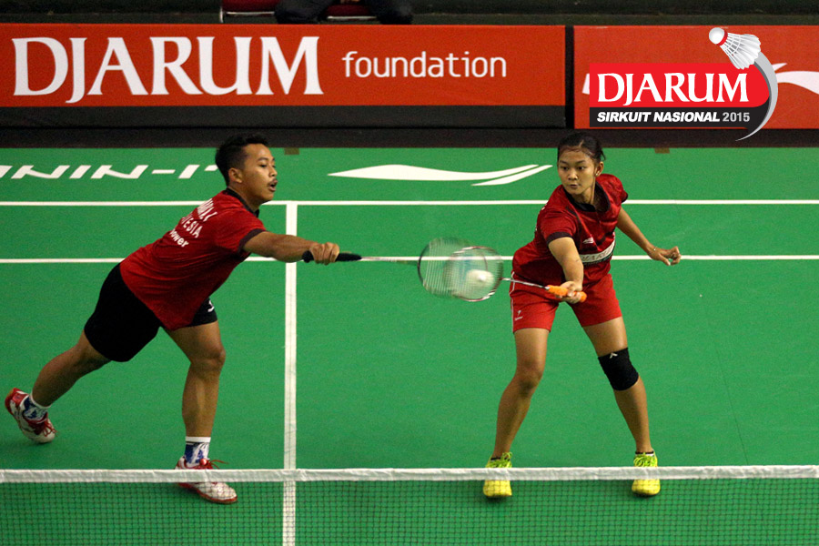 Fauzi Habibie/Apriani Rahayu (Pelita Bakrie) mengembalikan shuttlecock ke arah M. Agung/Anita (Hi Qua Wima/Citra Raya Unesa).