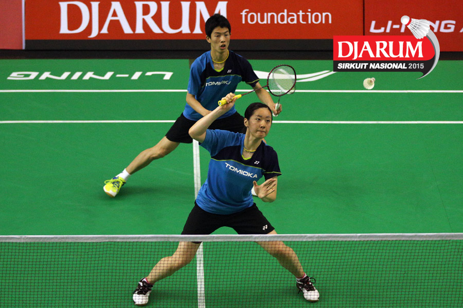 Taiki Honda/Haruka Nidaira (Tomioka Jepang) bersiap menyambar pengembalian tanggung dari Akbar Gusti/Serena Kani (Djarum Kudus).