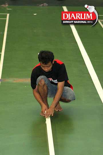 Seorang pekerja saat menuangkan cairan perekat untuk keperluan dekorasi pelaksanaan Djarum Sirkuit Nasional Li-Ning Jakarta Open 2014 di GOR Asia Afrika, Jakarta