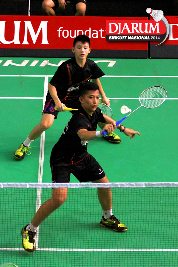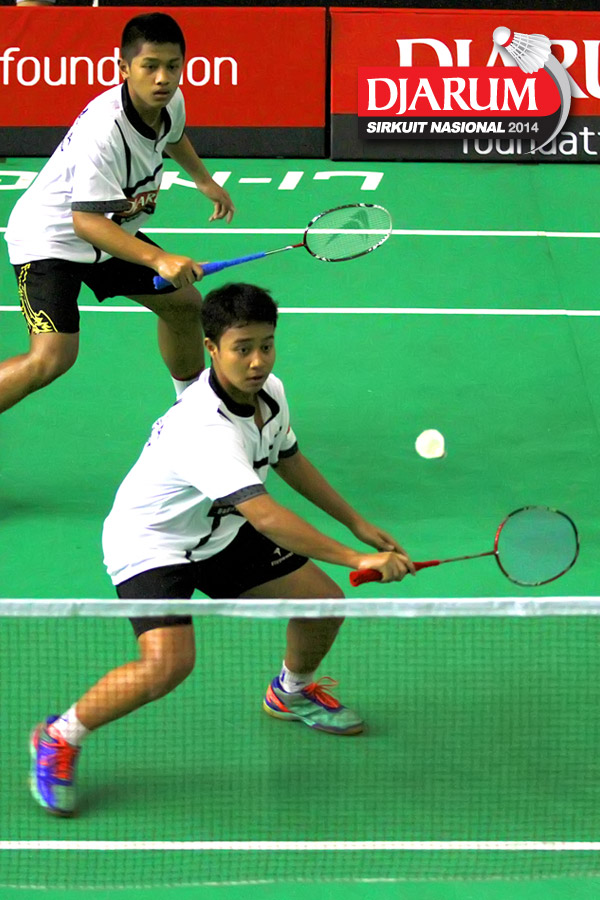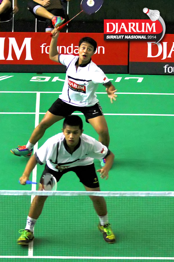 Ghiyats Afif/Stefanus Christian (PB Djarum) menyambut pengembalian dari M. Agus/Ricardo P. Liu (Exist)