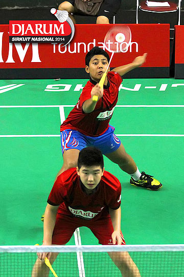 Arianto/Ridho (JR Enkei) bersiap menyambut pengembalian dari pasangan Koji Naito/Ryotaro Mauro (Jepang)