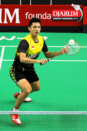 Anthony Sinisuka (Pelatnas) bersiap menyambar pengembalian tanggung dari Indra Setiawan (Pertamina Indonesia)