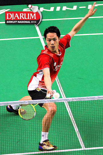 Kho Henrikho (PB Djarum) mengembalikan shuttlecock ke arah Naohiro Matsukawa (Hitachi Jepang)