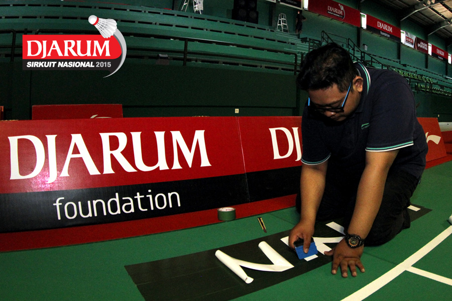 Salah satu pekerja memasang ads board Djarum Foundation.
