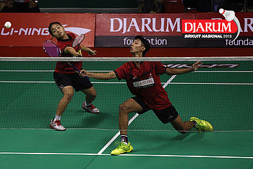 Moehamat Febriansyah/Rofahadah SUpriadi (Djarum Kudus) menghadang serangan.