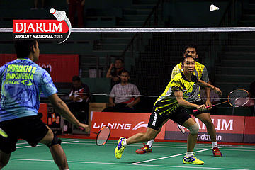 Bagas Kristianto (Djarum Kudus) bersiap menyambar pengembalian.