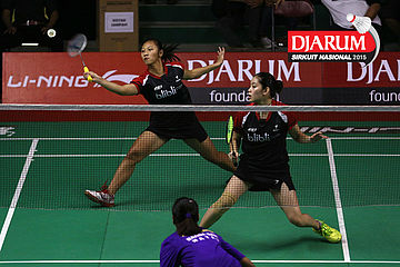 Cynthia Shara/Rofahadah Supriadi (Djarum Kudus) bersiap menyambar pengembalian.