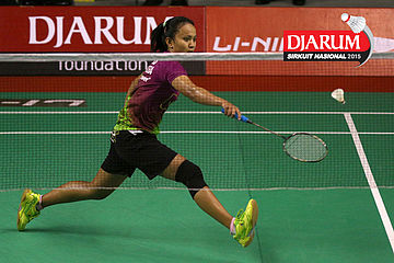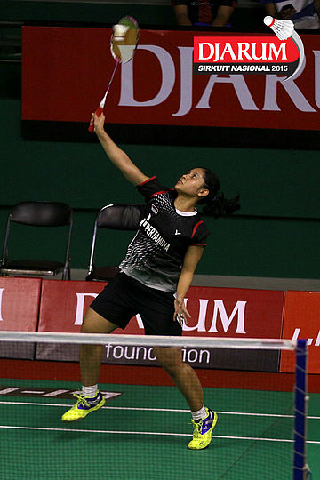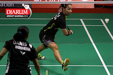 Ana Rovita (Pertamina Fastron) bersiap mengembalikan shuttlecock.