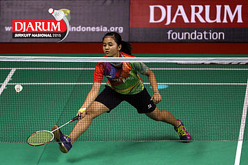 Asty Dwi (Jaya Raya) bersiap menyambut shuttlecock.