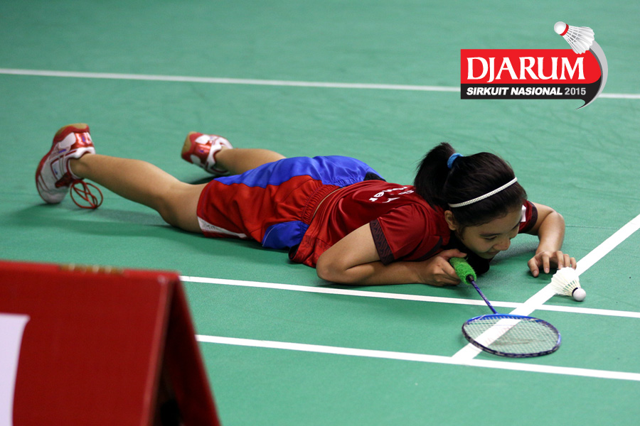 Titifany Illahi (Djarum Kudus) terjatuh saat berusaha mengembalikan shuttlecock.