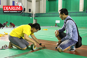 Tiga orang saat memasangkan material dekorasi Djarum Sirkuit Nasional Li-Ning Jabar Open 2014