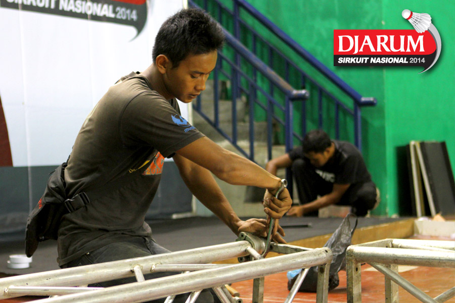 Seorang pekerja saat memasangkan material dekorasi Djarum Sirkuit Nasional Li-Ning Jabar Open 2014