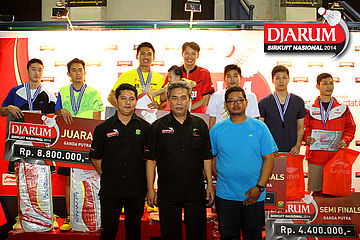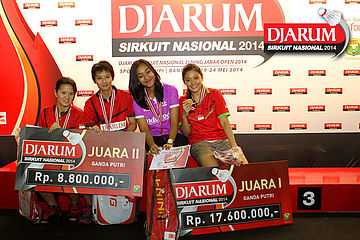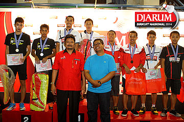 Afiat Yuris/Fran Kurniawan (PB Djarum) mengembalikan shuttlecock ke arah Erwin Wihardi/Syarief Syahmi (JR Enkei)