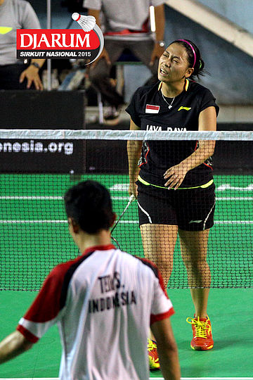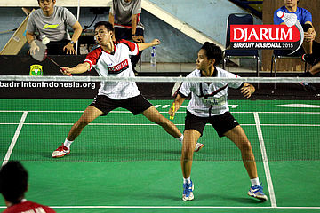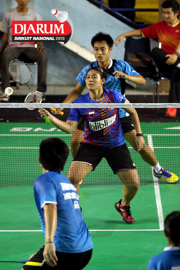 Lukhi Apri/Zakia Ulfa (Pelatnas) menyambar pengembalian dari Erwin Rendana/Dewi Setya (Bayu Kencana).