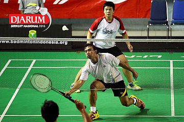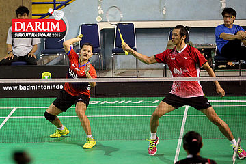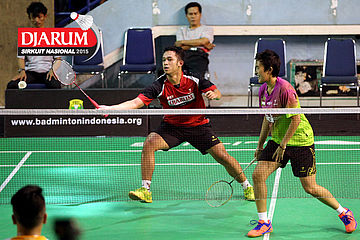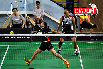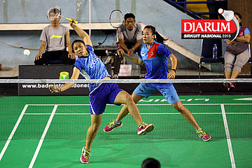 Irfan Fadilah/Pia Zebadiah (Jaya Raya) menyambar pengembalian dari Tedi Supriadi/Ririn Amelia (Djarum Kudus).
