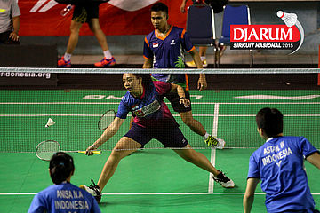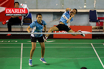 Lukhi Apri/Zakia Ulfa (Pelatnas) melepaskan serangan ke arah Erwin Rendana/Dewi Setya (Bayu Kencana).