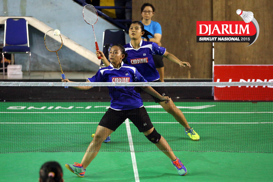 Dianita Saraswati/Yulfira Barkah (Mutiara Cardinal) mengembalikan shuttlecock ke arah Brigita Marcelia/Vehrenica Debora (Exist/Tangkas).