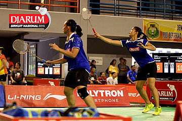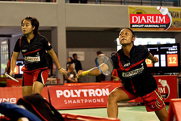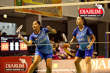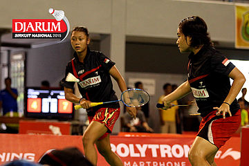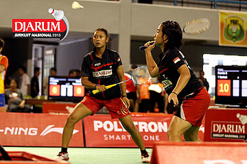 Dianita Saraswati/Yulfira Barkah (Mutiara Cardinal) mengembalikan shuttlecock ke arah Cynthia Shara/Rofahadah Supriadi (Djarum Kudus).