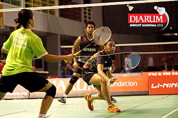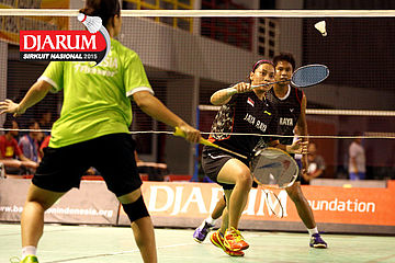 Cynthia Shara/Rofahadah Supriadi (Djarum Kudus) bersiap menghadang pengembalian dari Dianita Saraswati/Yulfira Barkah (Mutiara Cardinal).