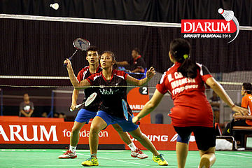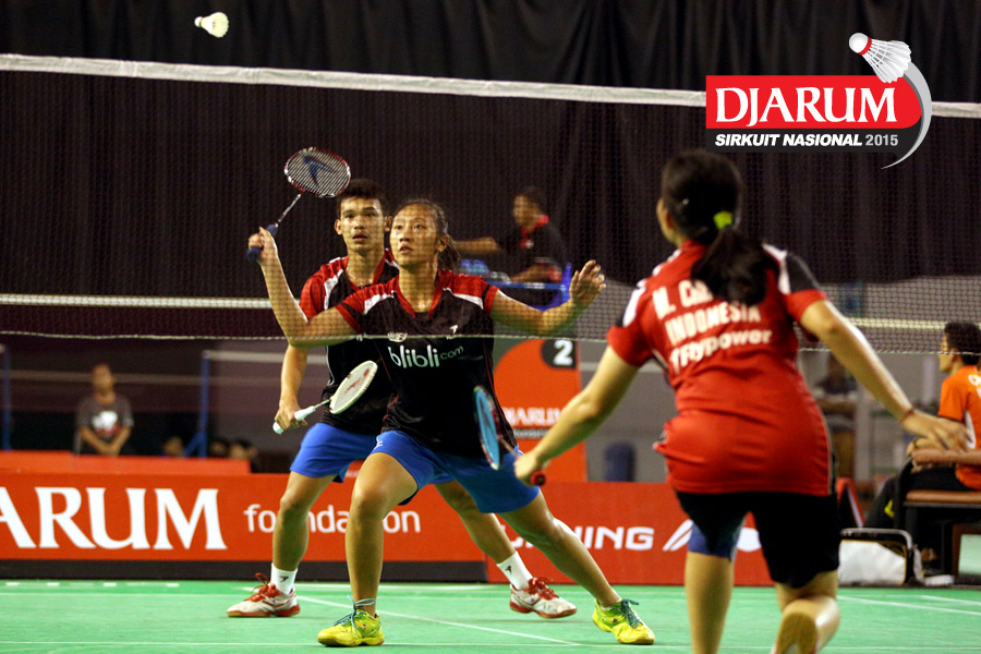 Irfan Fadilah/Pia Zebadiah (Jaya Raya) menyambut pengembalian dari Fran Kurniawan/Komala Dewi (Djarum Kudus).