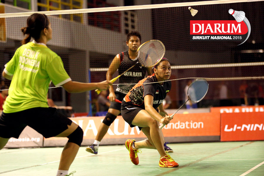 Fran Kurniawan/Komala Dewi (Djarum Kudus) menyambut pengembalian dari Irfan Fadilah/Pia Zebadiah (Jaya Raya).
