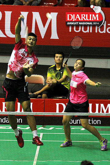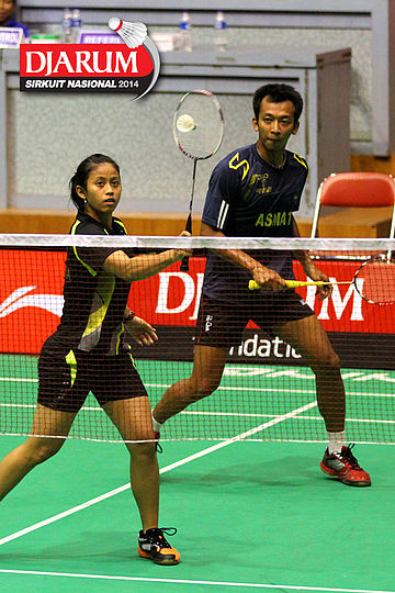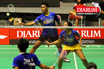 Anggun Nugroho/Dian Fitriani (Halim/Pertamina Fastron) menghadang pengembalian dari Wildan Atmaja/Wieke (Guna Dharma).