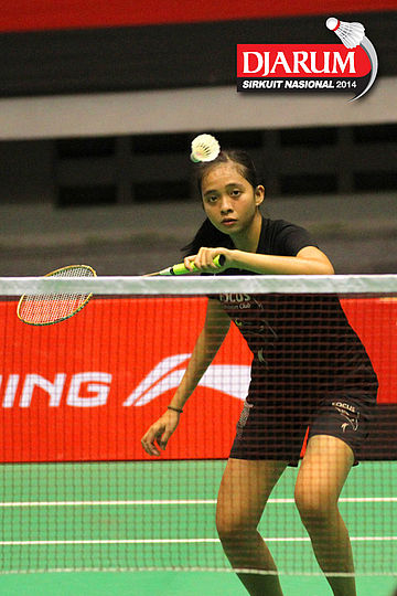 Novalia Agustianti (Tangkas) mengembalikan shuttlecock ke arah Monica Sandiya (Focus).