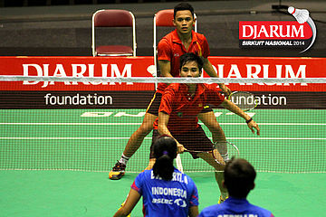 Ardiansyah Putra/Devi Tika Permatasari (Berkat Abadi) bersiap menyambut pengembalian dari Stefan Indra/Novalia Agustianti (Mutiara Bandung/Tangkas).
