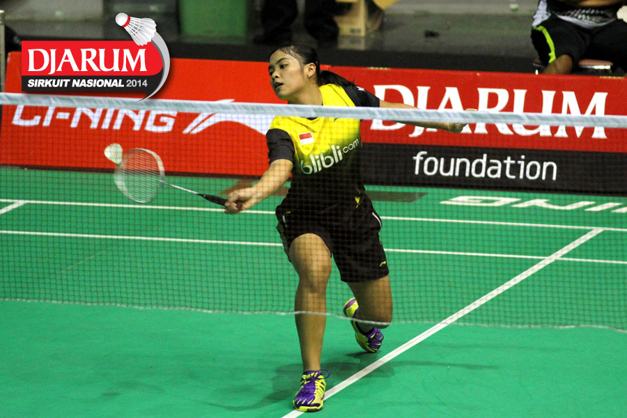Ganis Nurrahamndani (Pertamina Fastron) gagal mengembalikan shuttlecock ke arah Dinar Dyah Ayustine (PB Djarum).