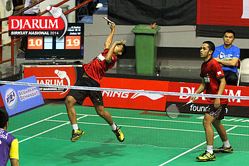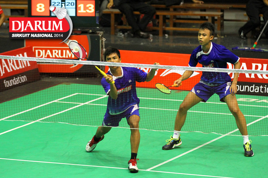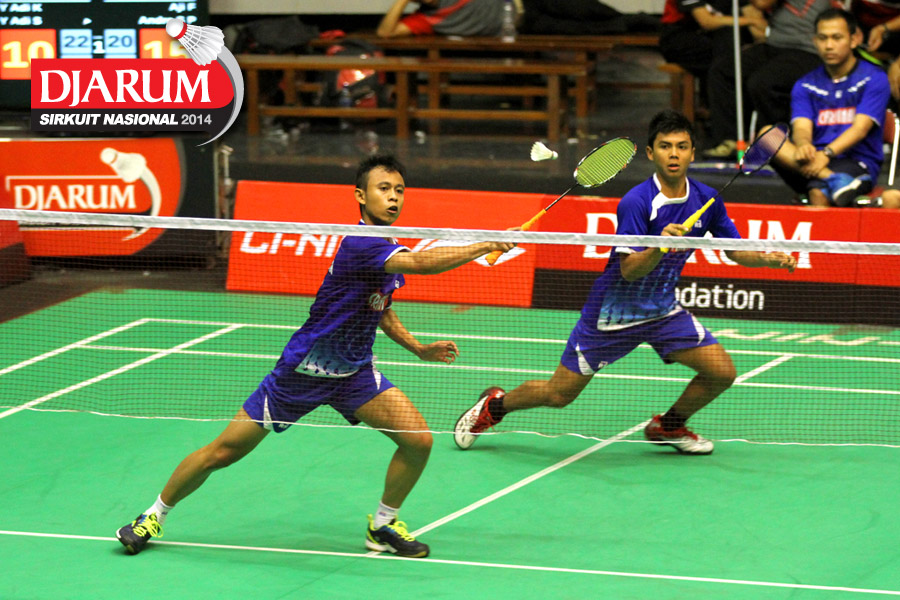 Akbar Bintang/Jeka Wiratama (PB Djarum) menyambar serve dari Endrue Tampi/Zachariah Josiahno (Tangkas).