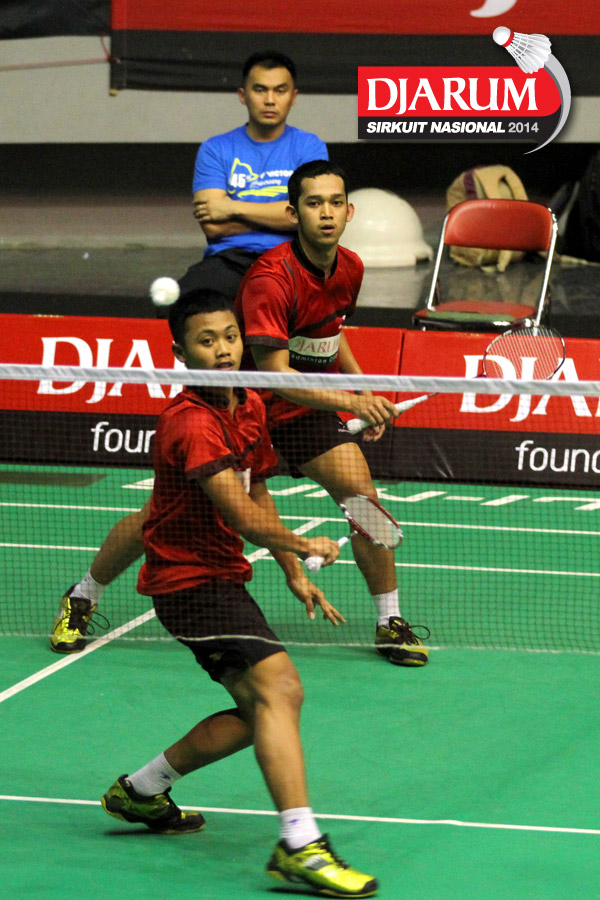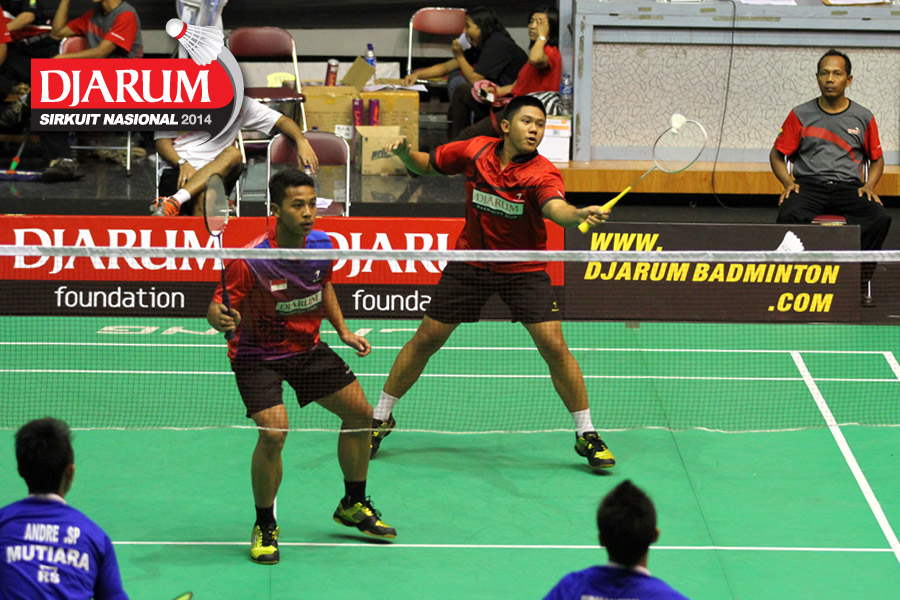 Yahya Adi/Yantoni Edi (PB Djarum) mengembalikan shuttlecock ke arah Aji Firmansyah/Andre Suryo (Mutiara Bandung).