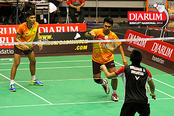 Afiat Yuris/Yohanes Rendy (PB Djarum) menghadang pengembalian dari Ardiansyah Putra/Fajar Alfian (Berkat Abadi/SGS PLN).