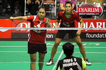 Dianita Saraswati/Yulfira Barkah (Mutiara Bandung) bersiap menyambut pengembalian dari Senera Kani/Vania Arianti (PB Djarum).