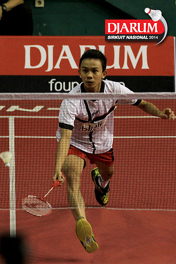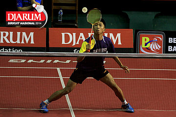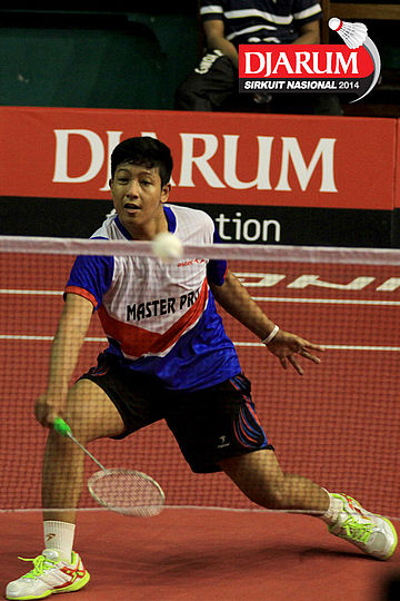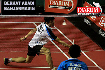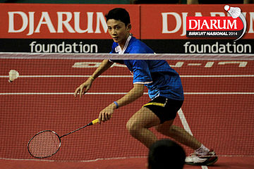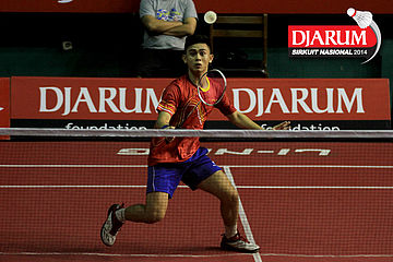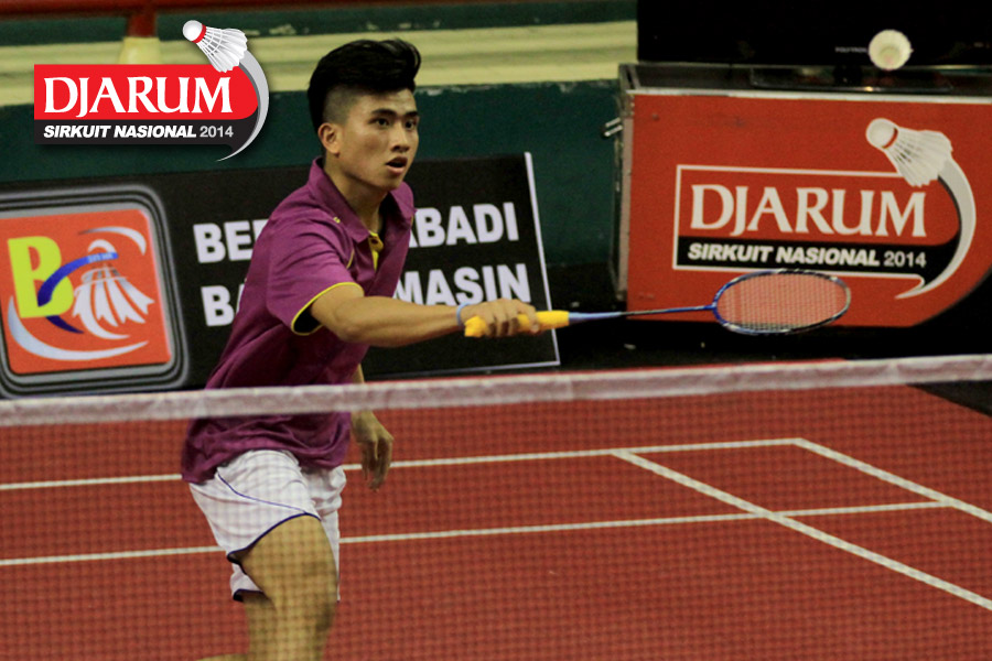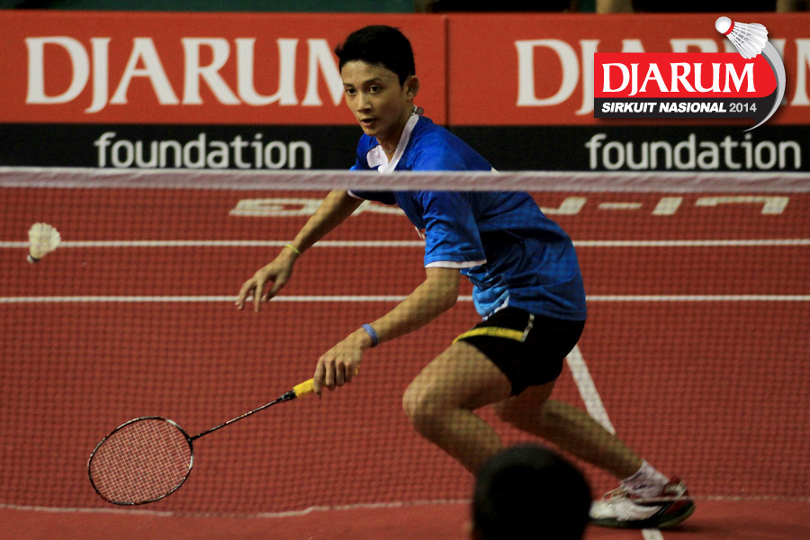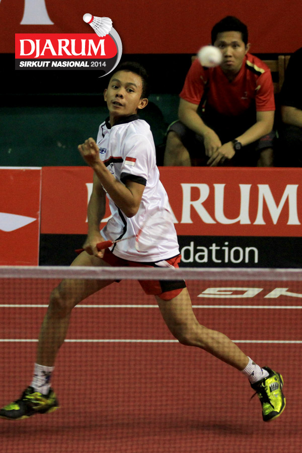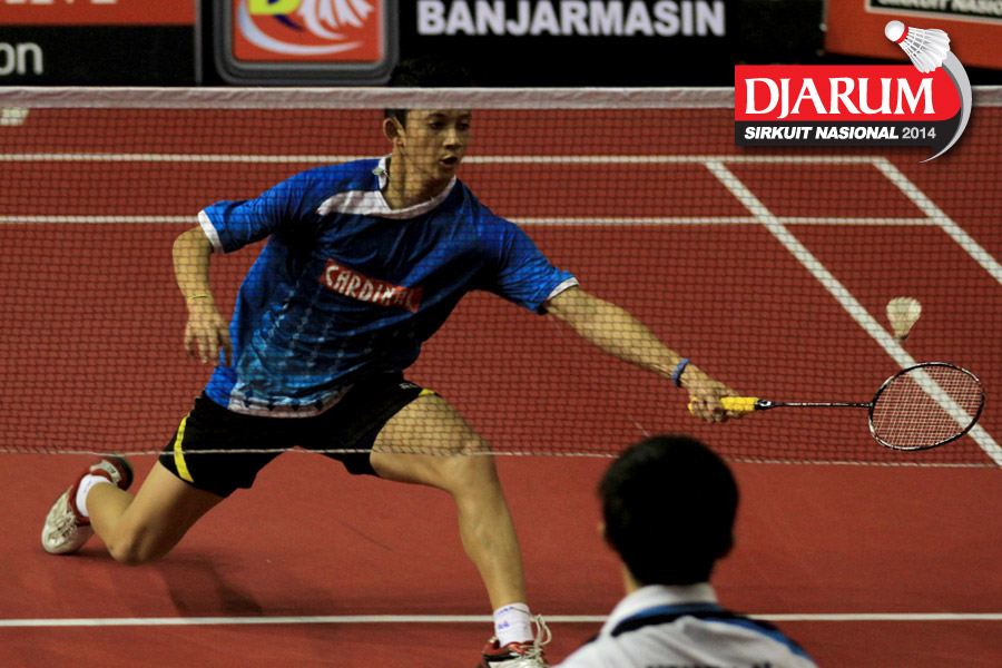 Ramadhani M. Zulkifli (Djarum Kudus) mengembalikan shuttlecock ke arah Wildan Maulana (Pelatprov DKI Jakarta)