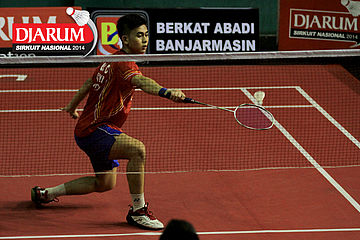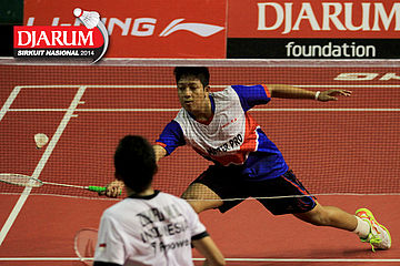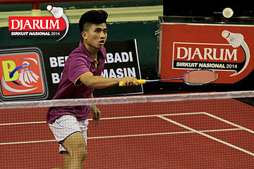 Kelvin Valentino (Candra Wijaya) mengembalikan shuttlecock ke arah A. K. Zailani (Mutiara Cardinal)