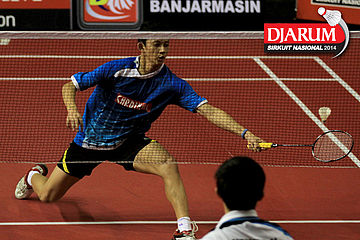 A. K. Zailani (Mutiara Cardinal) mengembalikan shuttlecock ke arah Kelvin Valentino (Candra Wijaya)