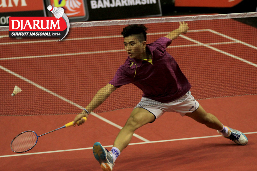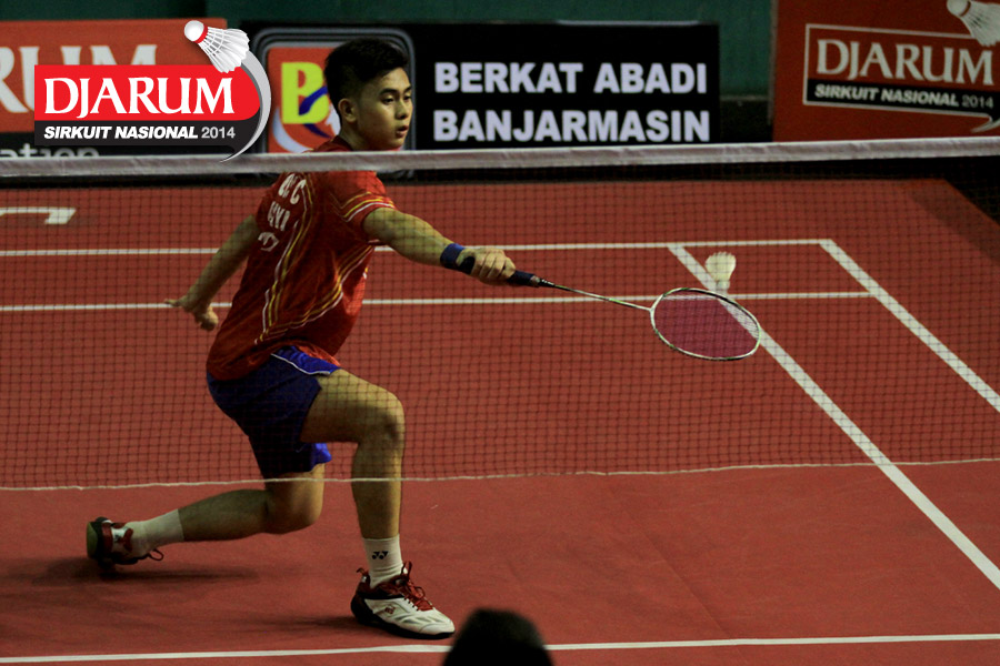 Wildan Maulana (Pelatprov DKI Jakarta) berusaha mengembalikan shuttlecock ke arah Ramadhani M. Zulkifli (Djarum Kudus)