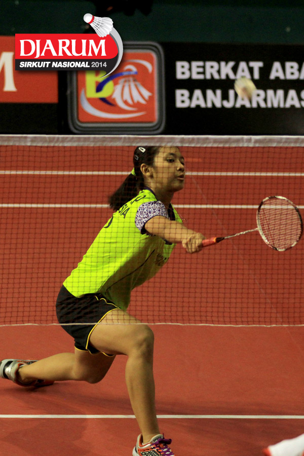 Marsa Indah (Djarum Kudus) mengembalikan shuttlecock ke arah Arieza Rizky (Victory Bogor)