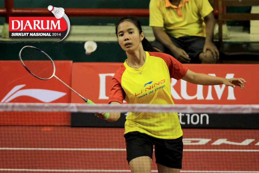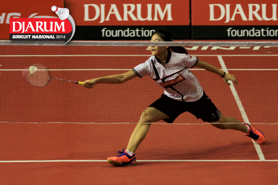 Devi Yunita (Djarum Kudus) mengembalikan shuttlecock ke arah Sandra Rahayu (Sarwendah)
