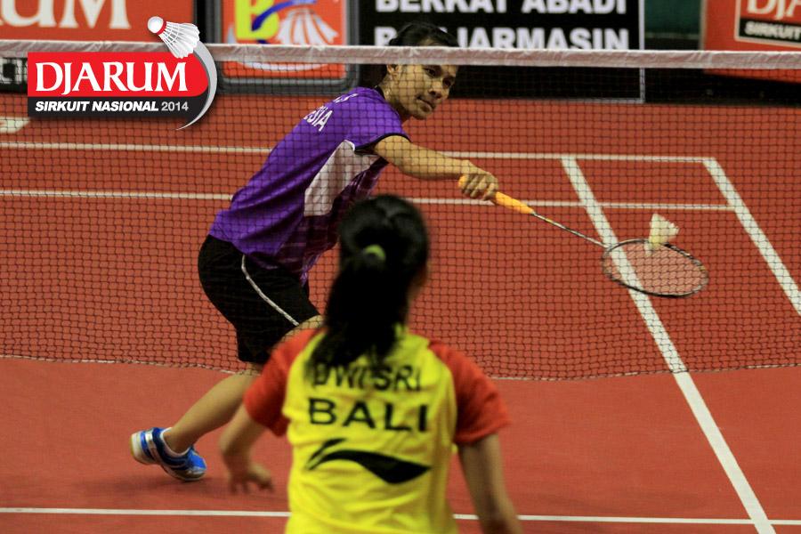 Priskila Siahaya (Exist) mengembalikan shuttlecock ke arah Made Dwi Sri (Pelatprov Bali)