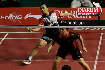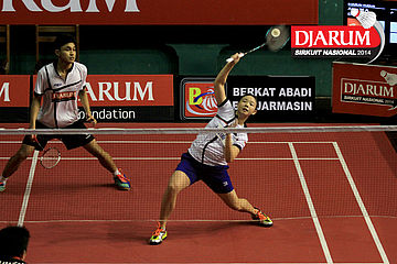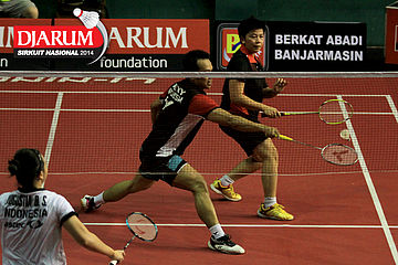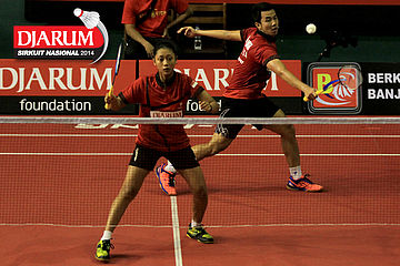 Indra Setiawan/Ganis Nurrahmandani (Pertamina Fastron) bersiap menyambar pengembalian dari M. Maftuki/Cindy Ong (Pelatprov DKI Jakarta/Malibu)