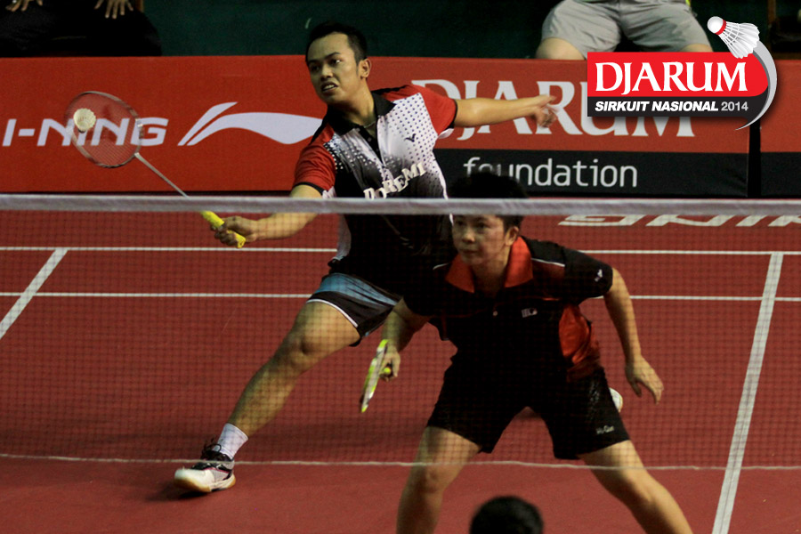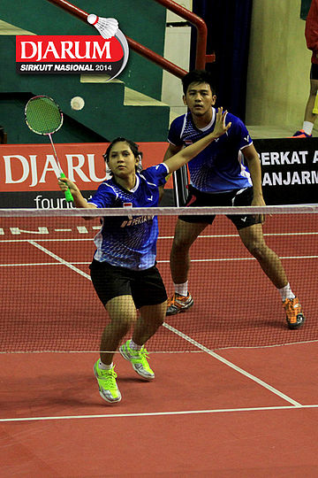 Indra Setiawan/Ganis Nurrahmandani (Pertamina Fastron) menyambut serve dari M. Maftuki/Cindy Ong (Pelatprov DKI Jakarta/Malibu)