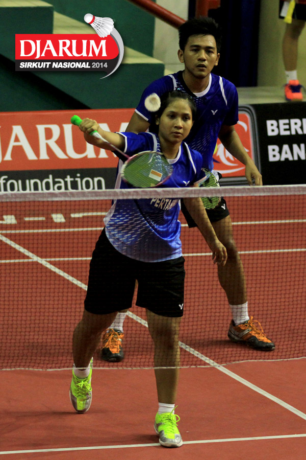 Arya Maulana/Della Augustia (Djarum Kudus) berhasil menghadang serangan yang dilepaskan Rizky Kurniawan/Natalia Poluakan (Doremi Group)